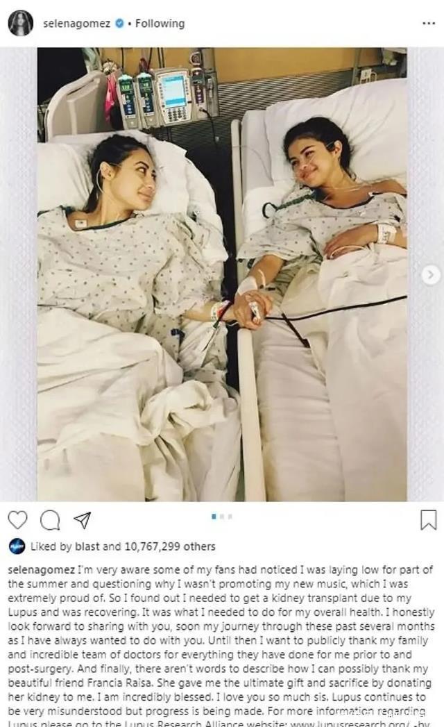 这事还是从捐肾开始说起:2017年,赛琳娜红斑狼疮复发急需换肾,她的好友弗朗西娅主动去做了配型检测,为赛琳娜捐出一颗健康的肾。 两人一起度过了艰难的恢复期,赛琳娜因为手术并发症导致动脉破裂,又被送去抢救,而弗朗西娅也因为捐肾手术忍受全身的剧烈疼痛,一度连出门遛狗都困难。 而且作为捐献者,她的术后康复进程比赛琳娜还慢……