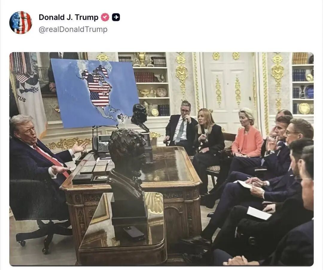 我看到,特朗普又在自己社交账号上,贴出了他在白宫会见欧盟领导人的照片。特朗普端坐老板椅,马克龙、默茨、冯德莱恩、斯塔默等一众欧洲领导人,对面排排坐小板凳。